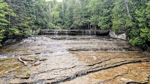 The road isn't open to vehicular traffic the entire way to the falls; it's gated, for access by employees of... the power company, I think? But you can still park near the gate and walk down. It was a cool and slightly rainy morning when we visited, so we didn't take advantage of walking in the water like others have. Still pretty cool, a little wider than many other falls we've seen in the UP. There appears to be some sort of trail winding along the east bank; we didn't venture too far along it because it wasn't exactly marked well, nor maintained, and seemed to have been the victim of erosion in several places. A little farther south on the road (closer back toward Autrain Forest Lake Rd), there's another place to pull out and park where you can see the other set of falls, which are even steeper (though much less water flowing over them). We were able to pick our way down to the base of this, though, again, doesn't exactly seem professionally-maintained or anything. Didn't see any "No Trespassing" signs or anything, though, so I...