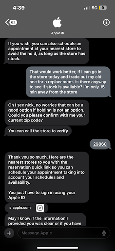 Best part is as I am backing out of my parking spot I get the text that you will be able to see us shortly. We already have a repaired phone in hand. So I texted back cancel, got the message saying Apple would no longer text me. I got 2 more texts telling me to come in, replied cancel each time and got the same message. Luckily the third time is the charm.