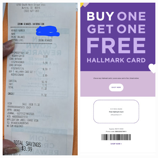 Why the 3 stars? Well, upon checking out, the employee was most likely prompted by the register as to how much to take off because of my BOGO Free coupon. I showed her that it explicitly says I can choose any Hallmark card and that the lesser-value was free.