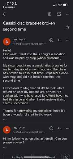 Recently, I had also gotten a permanent bracelet at Kendra Scott since I had my birthday discount. It was the worst experience. The associate had rushed through it as her chick fil an order arrived as she was in the middle of doing it. There was no protection between my skin and the welding device. My bracelet had been placed incorrectly with extra chain hanging off the side. I felt so awful and regretful after. It felt like I was cheating on Loveweld. Yesterday, Kirsten was looking at it and said she was super surprised it was still on based on how poorly it was welded. She offered to help and fix it. How sweet is that!! She cured my trauma from Kendra Scott!!