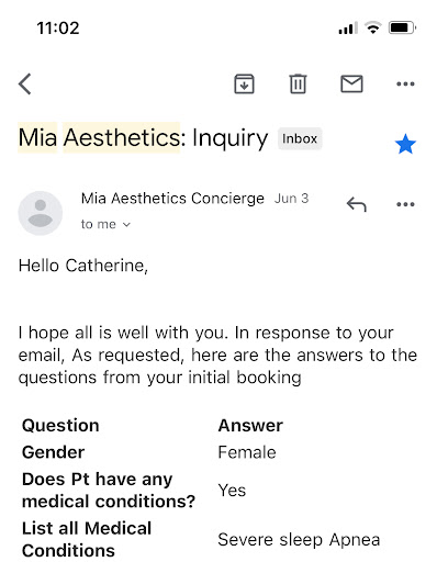 I hoped we would have come to a resolution before taking action but your poor communication leaves me no choice. I won't assume this has happened before but I will make sure no one experiences what I have at Mia Aesthetics. People considering this surgery should know the pain and suffering they may face other than recovery...