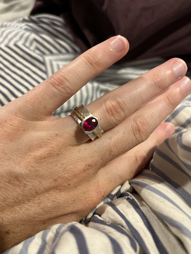 My wife and I cannot begin to convey the joy we have for the wedding rings that Kyle so meticulously crafted for us š! It has been nigh a year since this journey started with many failed expectations and verbal defeats as we encountered refusal after refusal pertaining to either the inability of the artist or the unwillingness to accommodate our requests. About two months back, my wife discovered Stones Throw Studio on Etsy and became enamoured with Kyle's designs. I, on the other hand, was not initially smitten as I had something very particular in mind with a stubborn inclination. Over the course of the next two weeks, I began to frequent Kyle's shop and discuss different styles with my wife all the while still retaining that notion of my 'ideal' ring that was slowly escaping my grasp. My wife then presented one particular ring for me that I felt drawn to and yet still resisted but not enough to prevent me from establishing contact with Kyle. From the beginning, Kyle was professional, friendly and most importantly, patient as I submitted numerous questions which he diligently answered. I never once felt ignored or seemed a burden. He even took time away from his busy schedule to take photos and a short video clip of our stones to ensure our satisfaction. Wow! Talk about customers service! When we finally decided to enlist his craft, it was divinely inspired. He easily integrated modifications we made to the design and completed the rings in an extraordinary time frame. The day our rings came home to us was a true blessing to which we celebrated by proposing to each other (again after 3 years) as we slipped them on our opposing fingers. My wife's ring is stunning with a radiance to match her own and I have hardly removed mine except from some stern insistence from the Misses to prevent neuropathy, ha! My ring harkens to the realm of fairytales and as I gaze upon it, which I often do, I feel as though I am of elven bloodline smitten most certainly... We can't thank Kyle enough for bringing our vision to fruition. He truly went above and beyond our expectations and delivered on his commitment to produce a quality product customized to our liking. We recommend his services to anyone wanting to branch out from mainstream styles, and be uniquely creative. Thank you again for...