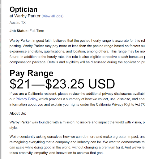 Optometrists at Warby Parker earn around $20/hr. That's the going rate for a babysitter and far less than most restaurants pay their staff. In Austin, $40k/yr. salary (equivalent of $20/hr.) is not even close to a living wage. You will get what you pay for. Like with cheap minute clinics, these are the bottom of the barrel Optometrists or first year grads. For my eyes and my family, I'll take a real doctor with years of experience.