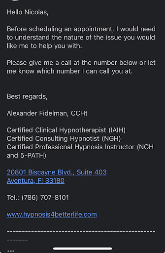 Read moreI had the privilege of working with Alex, a skilled and compassionate hypnotherapist, and I can't express how grateful I am for the profound impact he's had on my life. Walking into his practice, I had no expectations, but I was in for a journey that exceeded anything I could have imagined. Alex's approach to teaching and therapy is truly exceptional. He not only imparts knowledge but also creates an environment that encourages growth and self-discovery. The subject matter itself is fascinating, and Alex's mastery in delivering it makes the learning experience both engaging and enlightening. I approached Alex at a time when I was battling insomnia and struggling with chronic pain and burnout. After just two weeks of sessions, I began sleeping soundly through the night – a feat I hadn't achieved in ages. As the sessions progressed, I noticed a remarkable decrease in the symptoms that had once weighed me down. It's astonishing how far I've come, and I credit much of my progress to Alex's expertise. One of the most remarkable aspects of working with Alex is his professionalism and kindness. He's not only quick-witted but also deeply empathetic, making every session feel like a safe space to explore and heal. It's clear that he's genuinely passionate about his profession, and this passion translates into results. I wholeheartedly recommend Alex to anyone seeking transformation and healing. He's not just a hypnotherapist; he's a guide, a mentor, and a true partner in the journey to betterment. Thanks to his expertise and dedication, I'm on a path towards improved well-being and a brighter future. If you're ready to take control of your life and experience positive change, I can assure you that Alex is the person to trust. In sum, Alex's exceptional skills, coupled with his genuine care for his clients, make him an outstanding hypnotherapist. My journey with him is far from over, and I look forward to achieving even greater strides with his unwavering support. Thank you, Alex, for assisting me on my path to...