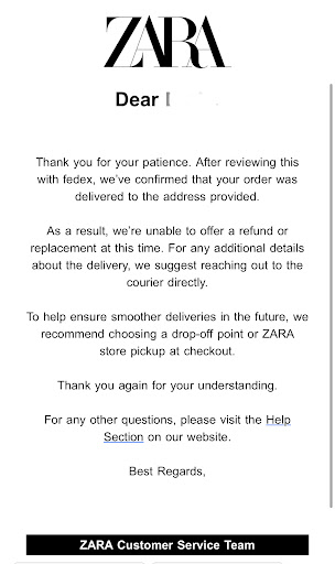 I hope Zara takes this matter seriously. Training employees to remain attentive and professional, while also showing empathy when errors occur, is essential to ensuring loyal customers like myself continue to feel valued.
