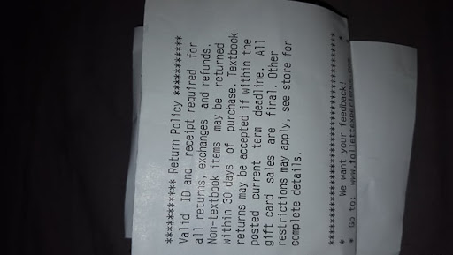 However, I walked back into the store and then stated that " On the receipt that you didn't give me the first time coming to bookstore stated that "Non-Textbook items may be returned within 30 days of purchases.