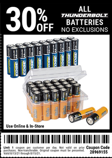 Read moreSad way to treat long time customers. I have shopped at HFT for over 20 years and spent thousands of dollars over that time. On 8/15/21, I received a coupon for 30% off Thunderbolt Edge batteries. This coupon was different from the normal coupons, in that it stated "No Exclusions" and "limit one COUPON per customer". Nothing was written that stated a limit on quantity. I asked my wife to use the coupon to buy 13 packages of batteries which she did. Upon her return, I checked the receipt and the clerk applied the 30% discount to ONE package only. Full price on the remaining 12. I went back in to the store on 8/26/21 with the coupon, my receipt and all the unopened battery packs. I explained my situation to the manager Sandy. She pointed at the coupon, where it read "limit one coupon per customer" and said it was rung up correctly. I replied that the coupon does not state a quantity limit and clearly states "No Exclusions". She looked at me, said sorry and basically walked away. The irony of all this was that the batteries had gone on sale for about the same price as the coupon price. Sandy never once mentioned this or acted like she cared. Never asked if I was an inside track member, which I am. Never bothered to look at my purchase history. All she seemed to care about was winning the argument about coupon verbiage. I like HFT. Have for a long time. But it's people like Sandy that will cause HFT to lose loyal customers for life. In the end, I was able to receive a partial refund due to the current sale. It's not about the money so much, as it is customer service. My decision to shop HFT stores again will depend on how they respond to this...