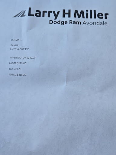Read moreService on a windshield wiper, $200diagnostic fee. Ok, really need it fixed it is what it is,but the catch is leave your vehicle until they can work on yours, in my case 3 days. Appointments are useless as it is a first come drop vehicle off are served accordingly. Diagnostics are performed and charged independently per technician used to diagnose your vehicle.... keep in mind for any major repairs on actual mechanic issue. My loophole around diagnostics is buy the motor for my windshield wiper and order them to replace it ay my own discretion, could be I self diagnose incorrecty but it is cheaper then $200 doagnostics flat fee. My choice but fine, I ask for a quote to be printed out for parts and labor involved with my self daignosed windshield wiper issue so I get this(as seen in image). Typed out prices, for all anyone knows can be magic numbers they felt like charging. There is no clarity or true businessman reciept identifying what you are paying for, yet they will charge you and keep your vehicle as much and as long as you please. Clearly there is no business to me made with Larry H. Miller as they are not operating a true service shop, will definitely not trust leaving my vehicle at such place and never the less allow work to be performed by...