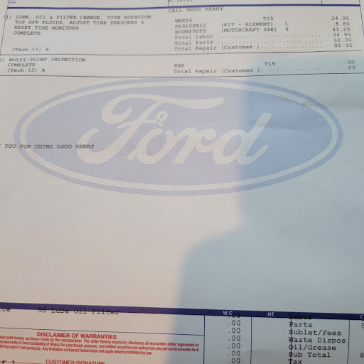 DO NOT TAKE YOUR VEHICLE HERE. This place will rob you blind. Iâve been told numerous times, that ever since this dealership went from Leo Venters to Doug Henry, that it went downhill, and I found out first hand this week to be true. I called last week about an issue, spoke with Danny the service manager, after he got my VIN and some other info, I was told that my problem would âmore than likelyâ be covered under my extended warranty, but theyâd have to run all the diagnostic tests to be sure what code would tell them exactly what was wrong. Fair enough. When I asked about the diagnostic tests being covered under my warranty, he led me to believe that they could run the test for no charge, because of my extended warranty, so I dropped it off to them to find out what was going on. When they called me back, not only was my problem NOT COVERED under my warranty (after being told âmore than likelyâ it would be), but then the year charged me $112 just to run the diagnostics on it to tell me what we already knew the problem was. When I questioned this charge, the service manager, Danny, was VERY rude and LIED TO ME AGAIN, saying that he had told me it would be $100 charge to run the diagnostics. HE NEVER TOLD ME IâD BE CHARGED $100. If he had, why would I pay them $100 for them to tell me what I already knew? I had already got the codes from the FREE diagnostic scan at Auto Zone. Itâs ridiculous enough for Ford not to cover a throttle body as âpart of the engineâ in my extended power train (engine, trans, drive train) warranty, but then for the dealership to screw me out of $112 and when I question it, to LIE TO ME again?? I WILL NEVER GO TO ANY DOUG HENRY AGAIN. They will NEVER get another dime from me. This place is NOT the same place with the same quality work and same honest staff it was when it was Leo Venters. THIS PLACE WILL ROB YOU now, led by their main thief and liar, their service manager. This place is a circus now, and this DANNY knows ZERO about good customer service. They donât even deserve 1 star, but thatâs the minimum I can do to leave a review to warn everyone, DO...