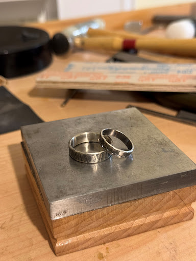 Making our own wedding bands and making them together has been an unbelievable experience that we'll cherish forever. Sonya's studio is lovely and she is incredibly knowledgeable, caring, and patient. I am still in awe of the fact that I was able to create a beautiful wedding band starting from a flat piece of sterling silver. Sonya takes you from start to finish with the patience that only great teachers have and never fixes things for you. She patiently walks you through it, which I so appreciated. Thanks to Sonya, we can now forever look at our wedding bands with pride and we can also remember how cool it was to make them together....