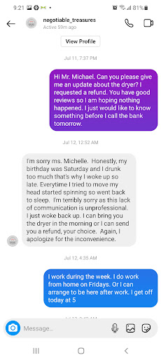 Ā Ā Ā Read moreMerchandise works from this business. I had to get a repair person to help me with a washer. there was a cord left in the dryer drum which could have potentially caused a fire in my new home. Merchandise came 5 days late because the owner got drunk the night before delivery. Iām in recovery so I didnāt hold this against him. he assured me that he would be at my home early the following Friday. he arrived Friday around 3:30pm. I had to call several times. I also had to request a refund to get him to respond. Ensure that he is delivering to you sober for your own safety. EDITED TO ADD: I had a repair person come to look at my washer. He found the cord in the dryer so I was not using the dryer. This man is just trying to make excuses for offering me a free cord, which is a joke. The day that it was delivered on should not matter. I was more than accommodating when someone never showed to my home the first time because he was drunk. I would show screenshots but the ones that prove he did not respond due to intoxication show my address. Therefore here is the Instagram thread that prove that he was neglectful. I also said this COULD HAVE POTENTIALLY CAUSED A FIRE. Not that it did. Put...