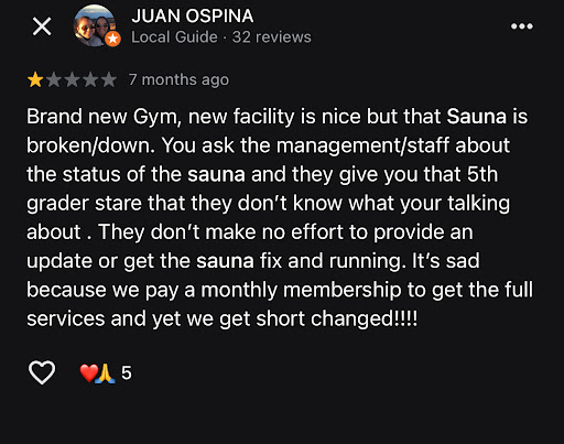 I joined LA Fitness on Boston Street almost 7 months ago, primarily for the amenities they advertise, especially the sauna. However, the sauna has not worked during my entire membership period. Today, I called to inquire about when it would be repaired and spoke with someone named Steven, who identified himself as the manager.