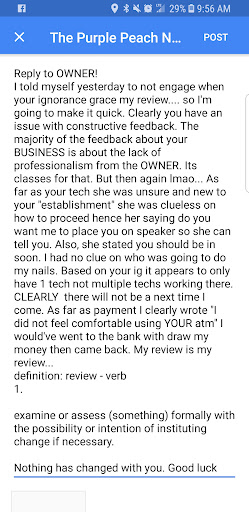 Ā Ā Ā Read moreAfter reading the reviews of the OWNER I want to say this to you Sis: 1st -congratulations on having the confidence to step out on faith and becoming an entrepreneur. It says much about your potential & worth. I've never been a client at the Purple Peach but reading your comments in response to your previous customers, is disappointing & a major deterrent. Your comments are unprofessional, grammatically erroneous, belligerent & all the things you don't want to see from the Owner. Your clients are always RIGHT! I hope you grow into a place of maturity & fortitude. Defending mistakes & condoning a poor attitude isn't the way to keep your customers but in fact causes you to loose more customers. Word of mouth and social media ratings are the platforms people use to decide whether or not they will take a chance on supporting your business. Also, developing your business skills, writing skills, speaking skills & customer service skills is your responsibility. Advance yourself. No one is perfect & grammatical errors occur often when typing......but at least attempt to proof read your submissions and clearly articulate your thoughts without being defensive. Owning a business doesn't make you smart or successful....valuing your customers & providing exceptional customer service can. Learning and making improvements when being critiqued is our goal. We sisters are the hardest on one another but the wealth of support one will receive from our own community is limitless if willing to consider what's being shared. Don't assume everybody is HATING on your accomplishments. I.....& those sisters who took the time to tell you the TRUTH about their experiences, care about you. We want you to succeed unless we say nothing, don't patronize & tell everybody about the horrible service....you don't want that. It's difficult for ANYONE to hear about their mistakes, inconsistency, imperfections & areas of weaknesses. Its hurtful, embarrassing, humiliating to be "called OUT" so we automatically want to "Fight Back". Except, no one is attacking you. Learn to appreciate those who are willing to tell you what you need to hear vs what you want to hear because it will make the difference in your growth. I'm sure you're doing your BEST but WE should always strive to become GREATER. Lastly, not every comment will be positive & not every customer will be satisfied because that's life and business. We ALL have days when our performance/services aren't up to par. Don't let the criticisms get you so worked up.....just do what you can to accommodate those as warranted & respond in love. I wish you continued growth and successes within yourself & in your businesses. I hope to learn more from you one day. Thank you for allowing me to...