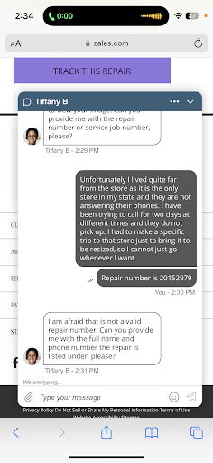 Read moreMy husband stopped by this store on Monday to get my ring sent out and resized. Their system was down so the associate gave my husband a written piece of paper with their name, employee ID, my repair number and what the repair was. He was told I would get an email later that day with the confirmation of my repair. It has been two days and I have not received any email. I have also tried contacting them via phone number for two days and have called over 20 times and not once has it been answered. Then I go to the main zales website and am told the repair number we are given is not valid and they cannot find it under my name, email or phone number either. At this point Iâm beyond frustrated and worried that my ring has been misplaced, however I cannot find out for sure because they wonât answer their phones. I lived quite a ways away from this store as it is the only one in our state so I cannot just go to the store whenever I please. My husband had to make a trip specifically just to drop the ring off for the resizing. I have also had their Live Agents contact the store manager by email twice with the request to contact me via phone and I have no heard back at all. If you are going to take someoneâs wedding rings but your system is down, you should contact the person to let them know what is going on with their sentimental item instead of leaving them...