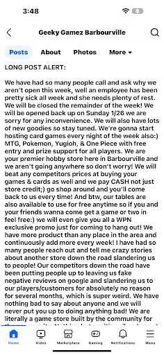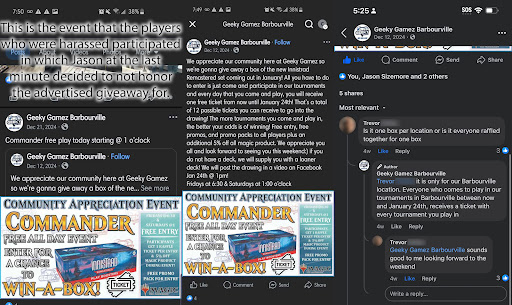 I am extremely disappointed with this store that advertised a "Community Appreciation Event" where participants that showed up to play in Commander events hosted there every Friday and Saturday between 12/12/24 to 1/24/25 were supposed to receive tickets towards a chance to win a booster box of Innistrad Remastered. I opted out of adding tickets to the pool in my name the times I played as I'm a new player that wanted the more experienced players in the community to have better odds at winning it as they wanted the booster box more. Not only did the owner, Jason Sizemore, tell another player that participated in the events he was not going to do the drawing, but when that player expressed being disappointed Jason resorted to insulting that player. Another player that participated left a review about this matter and Jason preceded to find her on FB and viciously harass her. I find that incredibly unprofessional and it discourages me from continuing to play. From what I understand he doesn't just stop at harassing his customers, but employees and competitors as well which he has openly defamed on his business page.