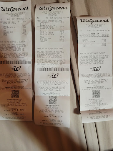Read moreOk so this post is not against the employees. It is against Walgreens business practice. If you notice on the receipt to the left it cost 15.99 sadly one of the photos wouldn't work for my babies passport no fault of the workers should I add. So I had to return it. If you notice the receipt on the right is the return receipt they was only going to refund 14.99 plus taxes. So the lady said that passport photos only cost 14.99 the receipt in the middle was the one for the photo that didn't work. It shows 31.98 for 2 passport photos I explained that 31.98 á by 2 is 15.99 I do think the lady got aggrevated at me for trying to show her, but as I told her if they take 1 from a million people then the made am extra million dollars. So sadly I was a complainer and I apologize for that, but that is bad...