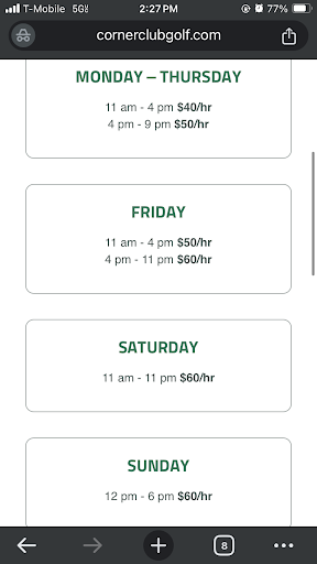 Read moreWe recently hosted a party at the Corner Club and LOVED it! We were delighted to find out that there are SO many games to play on the simulator other than golf. The kids loved playing football, basketball, carnival games and soccer on the big screen. Zombie dodgeball was also a huge hit. We rented two bays for two hours and the kids (and parents!) still didn't want to leave when our time was up. The employees were all incredibly kind and helpful and were attentive to our every need. We cannot wait to go back - a perfect way to spend time together with...