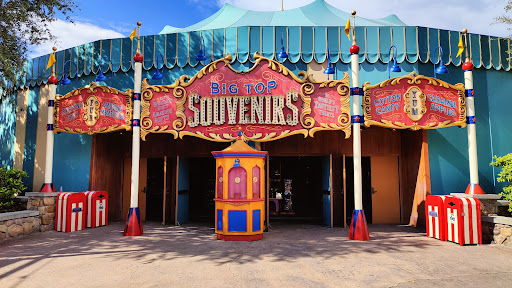 Read moreEverywhere you go in the Magic Kingdom, there are plenty of shops selling merch, pins, spirit jerseys ect. Big Top Souvenirs is a different breath of fresh air. Big Top Souvenirs is a great big tent that sells food, drinks and souvenirs. Coke/Sprite/Water, slushes, cookies/brownies, toffee apples, chocolate bars and cupcakes are just some of the treats available here. The standard Mickey ears, pins, toys, plushies, t-shirts and spirit jerseys are still available at the location, and it's well air conditioned, so it's a great pit-stop for a busy day...