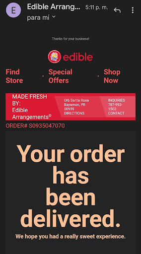 Read moreI ordered same delivery, paid extra for the same day and it was in the morning. I checked the status that afternoon no update. I called the woman that answered said hello, not Edible Arrangements and when I asked the status, she said the wrong name and hung up. I called right back no answe nor a call back. Needless to say, they never delivered and my boyfriend was waiting for a surprise that never happened I'm waiting for them to open tomorrow, but it's really sad when your dealing with people paying overpriced gifts for a special occasion and they...