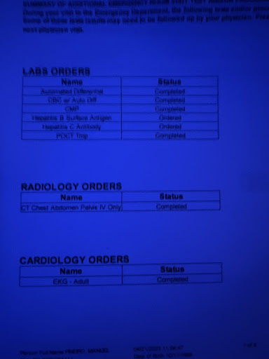 Read moreThis is why I hate going to the er. I got there a little before 10am. Been having a serious fever for 4 days ( now 6) with horrible body aches and chills. Went to see my regular Doctor first at 8:30am who did testing but sent me to the ER when nothing came up. The place was practically empty, only 2 patients before me. Why is there only one person to register you?? Terique was the only kind and EMPATHETIC employee as well as another male nurse with purple hair. A rude nurse had come in with the fluid you drink for a CT scan and was mixed with apple juice. I can't stand apple juice and I was already nauseous from the fever (they gave me nothing for the fever until hours later, an hour before my discharge. When I said it, he slammed the cup down in my face and said that I have to drink it to do the scan. I asked for something else to be mixed in. He refused and just gave it to me plain, which made me even more nauseous. Terique and the purple haired nurse gave me extra blankets and put cranberry juice and ice with the liquid. I was able to take it. I then was left in the room for hours with no one to check on me. Was hitting the call buttons to contact the nurse. I would hear the beeping go off but they literally just ignored me. All i heard was laughing. I was so miserable and cold and in pain. I cried. The fever and chills were so bad I started to sweat beneath the blankets. I wasn't given any relief until an hour before my discharge. I left at almost 5pm when I got there before 10am. Imagine laying there shaking and sweating for hours. They couldn't even find anything and I'm still suffering. Please...
