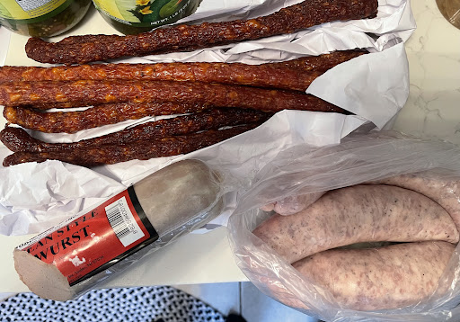 Hereâs what I got: ⢠A small portion of beef jerky ⢠Three small links of white sausage ⢠One piece of liverwurst