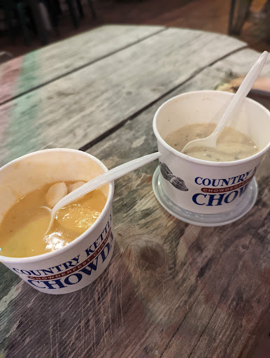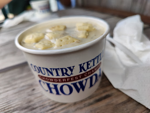 One of the many tourist traps on the island, and that's ok, but Country Kettle Chowda isn't a "4.7". Their chowder recipes are good, although a little too thin for my liking. Seasoned well, no problem there, but not including enough of the important ingredients, with CLAMS being the most important, isn't forgivable. It just comes off as stingy/greedy. Even the potatoes were short on quantity, which makes zero sense! I get trying to save some prep cost by skimping on the clams, but potatoes?? Gimme a break. And same goes for lobster bisque- good enough recipe, but almost zero lobster. And at these prices, the soups need to contain at least an adequate amount of clams/lobster. It's such a problem that the actual score should be a 3.5, but I've given them the boost because 3 stars seems too low. Very simple- cut the crap & add more clams/lobster so you're providing a good/great soup at a fair price. What you're doing right now isn't cutting it. Other reviewers have also noted the lack of clams. Maybe you don't care because it's a tourist trap & people are gonna buy it anyway, I dunno, but I'll get my chowder elsewhere on the island where the recipe is as good or better & is packed with seafood, as...