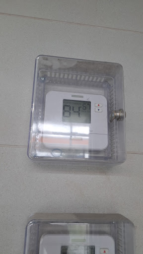 Thermostat is set at 85⁰. He unlocked the box and punch the button down 2 degrees. The air came on immediately.