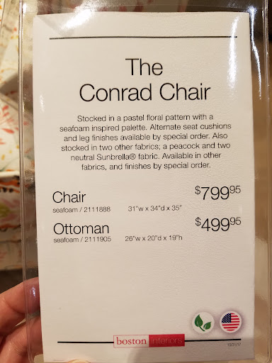 Read moreBoston Interiors gets a star because they have a very pleasant staff, and customer service was good to a point, however that is all that was pleasant about my experience with Boston Interiors. My furniture was delivered and the couch and ottoman were 2 different dye lots. Returned the ottoman and figured I would get something to compliment the sofa. The sofa was for our basement for our teens to hang out and watch TV. After 4 months the cushions on the chaise would not fluff up, basically they would not retain their integrity. BI said they would send me another cushion to the store and I would receive it in 4-6 weeks. I picked up the cushion, had to walk it awkwardly thru the store in a huge box. When I got home (after the 30 min trip each way) they gave me the wrong cushion. I then drove it back and asked for a refund. NO REFUNDS. Instead, I could get a store credit and pay MORE for a couch since prices went up!! No thank you. I settled on a couch 19" smaller without a chaise just to use up my credit. I am so discussed with BI for making me use my hard earned money on such junk and ending up with something I totally did not want. They have lost a customer. Next time BI give the refund...