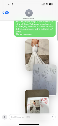 The Gilded Thimble came highly recommended by friends in the Bedford area. When I called to inquire about making an appointment to have my wedding gown altered, I was rather surprised to hear that the earliest appointment would be nearly a month out! I soon found out why-Carissa is a bit of a miracle worker! She offers a flexible schedule, and was even able to meet me after normal business hours-a huge bonus as I live and work in Lynchburg. When I came in, she did inform me that we had a bit of a problem dress on our hands, purely due to the style and way the dress had been constructed. Though I loved the elegant lines of the dress and modern look, it didn't fit well anywhere. She said that I would need to book her for a full day as it would take some experimentation to get the results we wanted. I came back today, and I am beyond impressed! I walked in at 830 this morning, and took my dress home at 1130AM! She worked efficiently, even handling other clients' needs while I was there. After three fittings as she worked, the dress is perfectly done-my fit-and-flare mermaid style gown now hugs in all of the right places and fits like a glove! Carissa even worked up an itemized list as well, and offered the option for me to pay whichever was cheapest. In the end, I paid for her 1/2 day rate. The price was very reasonable, and even included my bustle AND crinoline! YAY!