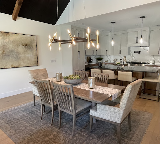 When I moved to my new home, Kris utilized existing furniture, artwork, and accessories to the extent possible, offered design solutions, and incorporated additional items as needed. She sold me window treatments, which included woven shades, custom curtains, and automated roller shades. I replaced builder-grade lighting with gorgeous Ethan Allen chandeliers with Kris’ help. The most dramatic change was a complete modern makeover of the master bedroom, which included a bed, night tables, chair, rug, artwork, unique lamps, accessories, bedding, and a bold steel blue wall paint that coordinates perfectly. Finally, I love my new sectional sofa because the family, including the pups, can all sit together. The woven textured floor lamp, upholstered barrel chair, transitional console table, and serving table were also great additions.