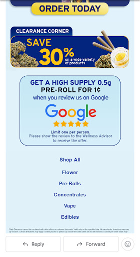 I have to say, I was pretty disappointed when I saw Clear Sky Cannabis's latest email promotion. I'm a big believer in honest and transparent customer feedback, and what they're doing really undermines that. They're offering a "HIGH SUPPLY 0.5g PRE-ROLL FOR 1¢" just for leaving a Google review. This isn't just a sneaky marketing trick; it's a clear violation of Google's policies, which are put in place to stop businesses from paying for good reviews. When I see a deal like this, it makes me question every review on their page. How can I trust that the reviews are real when people are getting a reward for leaving one? It hurts all of us as customers because we rely on those reviews to make smart choices. I really hope Clear Sky reconsiders this approach. They should be focused on earning great reviews the right way—with great products and great service. It's time for businesses to be held accountable and to champion a marketplace where transparency is what matters, not who's willing to manipulate the system.