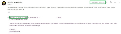 I booked 2 skydives over a month in advance and paid via PayPal. I did not receive a confirmation email so I had to reach out myself and ask if the reservation went through. A few days later, staff tells me PayPal is not accepted and they cancelled the transaction, but asked me if I wanted to confirm my existing reservation and that I could pay in person. I responded “yes” quickly but I did not receive a confirmation email.