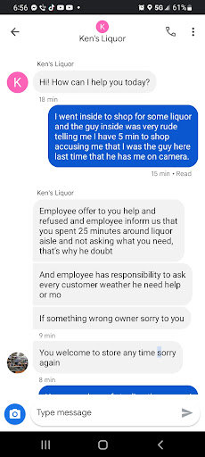 Today I walked into Ken's liquor and was absolutely disgusted, they are price gouging which is against the law ,you cannot raise prices more than 10 percent buy state law ,the price of items I normally buy there are way over priced we are in a crisis now and you sir are taking advantage, a case of water $15,we are the people in your community and do you normally sell a case of water for $15 ...the govorner of California said this is price gouging be on the look out and report it .so I will file a complaint, .remember sir was goes around comes around,we all go through difficult times but we should be helping eachother instead of trying to make a dollar ,and sure you didn't have to sell a whole case and I know your limiting things but right...