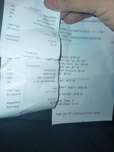 Read moreIf I could give this place zero stars I would. I used to go to this place religiously. However, over time they lost their appeal and just became a trashy dispensary. Their bud tenders are inexperienced and dress like they just got out of bed. The younger tenders have no idea about the products they are selling. They rely on a computer description vs live use. The tenders never weigh anything in front of you. I have had purchased 3 times in the past and it didn't weigh properly. Some of the tenders will joke around about very inappropriate language and sexual jokes racist jokes etc. Many times I was up sold or pushed to purchase something I specifically said I didn't want. The wait time is ridiculous for how many employees they have. The drive thru is literally never in use?! ....just making your own jobs harder. One time I went through the drive threw when it was working and the lady at the window took an expired identification card and sold to me anyway and then proceeded to staple my license in the bag with the product? What?! Just go to high profile. Better products. Better associates who are knowledgeable. They weigh it out in front of you and can really help get you what you need. High Profile is the way to go. This last time ...ever I went flora farms I bought a Half of 25% indica. It didn't weigh properly, it burned so quickly no matter how I smoked it...and it didn't last at all. I did not feel any type of relief. I will never waste my money again at...