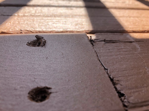 They then proceeded to install about 1/3 of the boards incorrectly, either cutting improperly so that the new boards jutted out from the edge of the deck, or messed up the screws so that they protruded out from the deck floor. Then they proceed to coat the deck in the most haphazard fashion possible. Several areas were either not fully coated or not touched at all. Large blotches of coating were left to solidify in several places. They absolutely dosed the tree next the deck in their coating, killing off large sections of leaves.