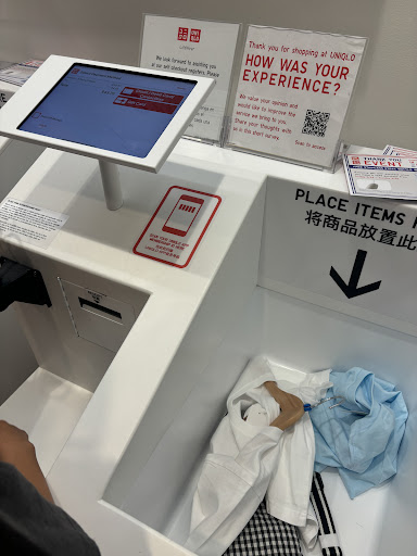 Somehow, the store's alarm was set off. He heard the alarm and stopped looking very confused. Two UNIQLO employees rushed to help him and the store manager was the third employee who also quickly got to the scene. I watched the three UNIQLO employees got each garment out of the bag to investigate the problem. I also saw a brand new receipt being pulled out of said bag and was carefully examined by one of the UNIQLO employees. They couldn't figure out what triggered the alarm, so the manager invited the young man back to the cash register to resolve the issue.