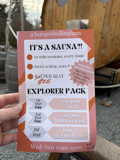 Read moreIf you like a good sauna to sweat out a stressful week, make your way down to HotSpotBellingham in Fairhaven right next to Stones Throw Brewery. If you don’t like saunas send a nurse or a nursing student as a gift, nurses need help taking care of themselves! Go online to reserve a spot, or call them if you struggle in that area(we found their online portal easy to use). Their sauna gets toasty warm, there is a barrel of cold water with pitchers to toss over your body, and they have bathroom, changing room, and shower in the little house south of Stones Throw. We had it to ourselves for 50 minutes, but there can be up to 8 people at a time. Wear slides, a suit, bring a towel and water, or rent towel and buy water from them. Seriously it is clean and warm and wonderful, I will return, often! The only thing that would make it better is if it was in my...