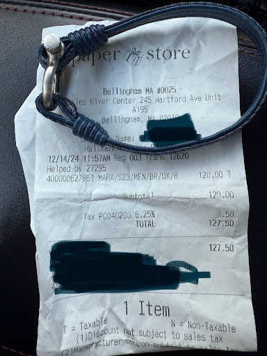 I recently had an extremely frustrating experience at The Paper Store in Bellingham (Store #0025). On January 4, 2025, I went to return or exchange a Cape Cod men’s bracelet I purchased on December 14, 2024, as a Christmas gift for my daughter’s boyfriend. The bracelet, valued at $120, was defective and completely unusable.