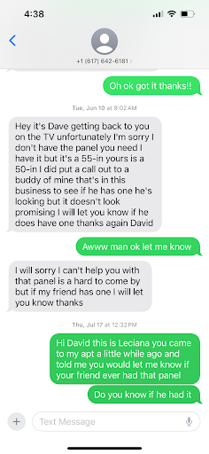 Read moreKinda feel like I got scammed by this guy he came to my apt, I paid my 75 deposit and he took a look at the tv told me it was irreparable because they no longer make my tv panel or something like this then he told me he would go home and look to see if he had the part he went home and texted me he didn’t have the part and maybe a buddy of his might and he would let me know. After that I never heard from him again I’ve sent texts just to see if there was an update and he just ignores them. I had another tv that broke and I have filled out the form on his website and he still has ignored those requests too not sure if I did anything to this guy for him to discontinue service but it’s a little unprofessional. Save your money go elsewhere.