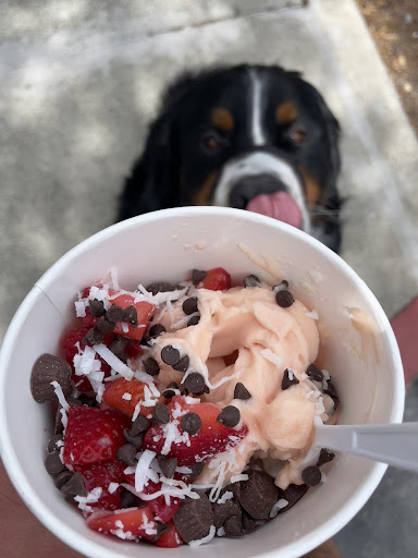 Great flavors including a rich chocolate, strawberry kiwi, even Dole pineapple whip! Loads of toppings! Reasonable prices! Good to know that some of their well-deserved profit is going to local children’s charities. The decor is colorful, bright, and fun. There’s a convenient parking lot on two sides of this corner shop.