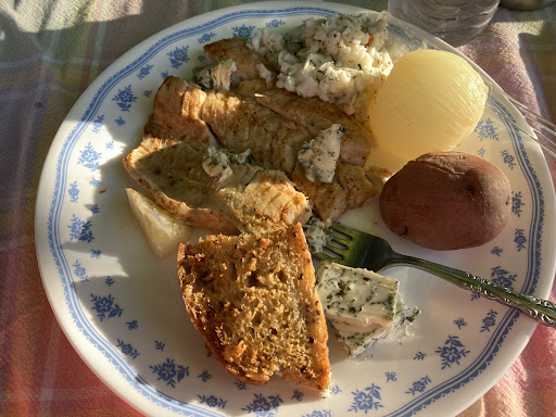 Tonight a group of our cousins attended one of their outdoor Fish Boil Dinners. It’s a really unique experience that you need to try at least once. There’s a lot of history to the way the fish is prepared and Barbara gives a very interesting presentation on how the fish boil process actually works. The skillful “Boil Masters” do an amazing job of preparing the fish, and the big event of the process is when they throw kerosene on the fire to make the pot boil over, releasing the oils. It’s truly an amazing thing to see! We sat under big trees, on long, white, painted picnic tables sporting colorful pastel table cloths. There were a few children there, but the groups were mostly adults tonight. The food was more than plentiful… a delicious feast of Lake Superior Whitefish, redskin potatoes, onions, coleslaw, garlic toast, specially created herb butter, and best of all…tada!…a slice of cherry pie with ice cream!