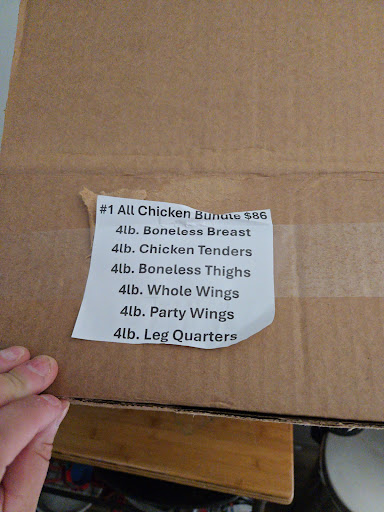 Read moreI have mixed feelings about my recent visit. On one hand it’s nice to have access to more affordable meat and support a localish (we drove from Raleigh) business but on the other I wasn’t super impressed with the quality. We got a number of things- wings, tenders, and a tritip. The wings were good. They cooked up well and we enjoyed them. The chicken tenders were really slimey and just had an odd amount of liquid in the bottom of the package. The tritip was really disappointing. I haven’t had one since I worked at a butcher shop back home and was very excited to prepare it but it was definitely spoiled after just two days in the fridge. My boyfriend opened the package and it smelt like sour cream, we tossed the whole thing.