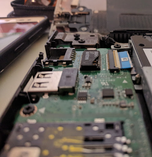 Examining the Ethernet controller integrated circuit, I noticed about 1/8th of the IC's cover had been ripped off. The laptop had never had any form of exterior damage, or drops from high surfaces, nor had it ever been opened since it was 'upgraded' by Best Buy's team at Benton Harbor, MI.