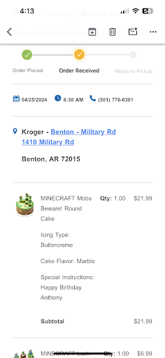 Read moreIf I could rate zero stars I would. I am beyond pissed. I ordered a Minecraft cake and cupcakes for my sons birthday. I ordered a couple days before so they wouldn’t have to rush. My order was confirmed for 830am 04/25/2024 which is today and the day of my sons birthday and his party. They did NOT have his cake or cupcakes. They pretended like they did not receive any information on the cake. I asked to speak to the manager. The assistant manager came and asked if I had the correct store so I showed him my email confirmation with all of it and he confirmed it was correct. All he did was take a photo of my email confirmation and say he will look into it. That’s it. No apology, no cake comped, no “have a good day”, nothing. Never ordering a cake here again. I went to Walmart for a birthday cake after. They could’ve called me today or a couple days before saying they won’t have it or something as a heads up. 1410 military road,...