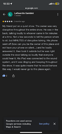 Read moreEdit to respond to owner's response: if you weren't talking loud enough for everyone to hear, how did I know you were talking?