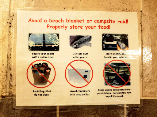 Horses are smart. They will get into your plastic bins and will definitely eat any food that is left out in a bag. On the National Park side, you can lock your food in a gated area underneath the picnic tables, but on the state park side they don't have a place to lock up your food. Do not assume that your plastic storage bins or coolers are safe unless they are stored in your car or have a strap around them that prevents them from being opened. I have seen the ponies open and dig through so many picnic tables, coolers, and bins through the years. Once the horses realize they can get food from campers, they become bold and unafraid. Next thing you know, they're approaching cars and people for food, and as a result, getting hit by cars and/or biting/kicking people who get too close.