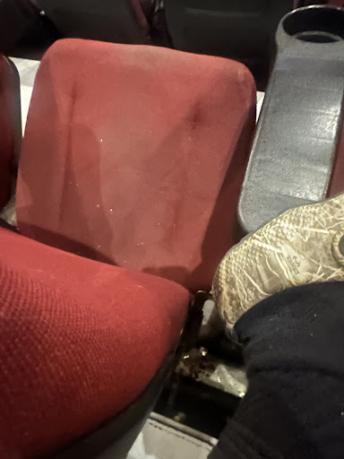 Upon entering the theater, we were greeted with cloth chairs that are heavily stained and the carpeting was COMPLETELY covered with popcorn residue. The temperature in the theater was unbearably HOT as well. Never been in a theater where I had to remove articles of clothing because I was so uncomfortable.