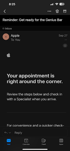 I arrived at 6:15p and made an appointment for someone to fix my iPhone 5. (It got locked in an error loop when trying to reset it via iTunes and all home remedies failed to bring it out of its coma.) I swear the young clerkbot checked its Facetime feed at least three times while trying to set my appointment. It told me it would be until 8p before someone could help me. Fair enough - I had some shopping to do and figured I could waste the rest of the time. About 45 minutes into my wait I received a text showing the my appointment time was now 8:50p. I was close to the store so I returned to inquire as to why the delay. The first clerkbot was nowhere to be found, but an almost identical replacement unit stated the store had to go by the text and not what I was told earlier. OK, I told it I probably won't be able to wait the additional 50 minutes, but had a little bit more shopping to do so I didn't cancel.
