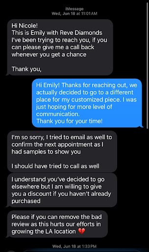 Read moreI recently purchased a wedding band for my fiancée through Reve, and the experience was nothing short of exceptional. Emily was incredibly helpful throughout the entire process—her customer service was outstanding!! She took the time to understand what I was looking for, offered thoughtful suggestions, and made sure I felt confident in every decision. I am a big procrastinator and waited til last minute to get a custom ring done and Emily made it happen getting the final ring ready on time🙂🙌🏼 The final result was beautiful, and my fiancée absolutely loves it!...