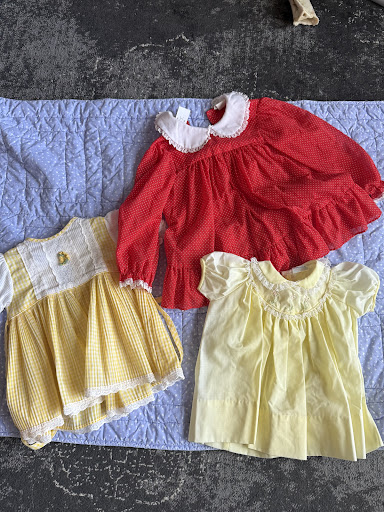 She then tells me the dresses I'm looking at are too small (I know. I was just looking), puts back the dress I was holding up to me, and points me to dresses that are larger and comments on my "broad shoulders". She told me that dresses of that era had no spandex and therefore, no "give".